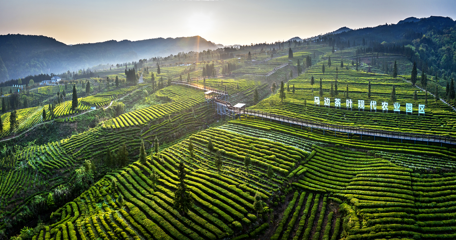 朝阳映照下的茶叶产业园区