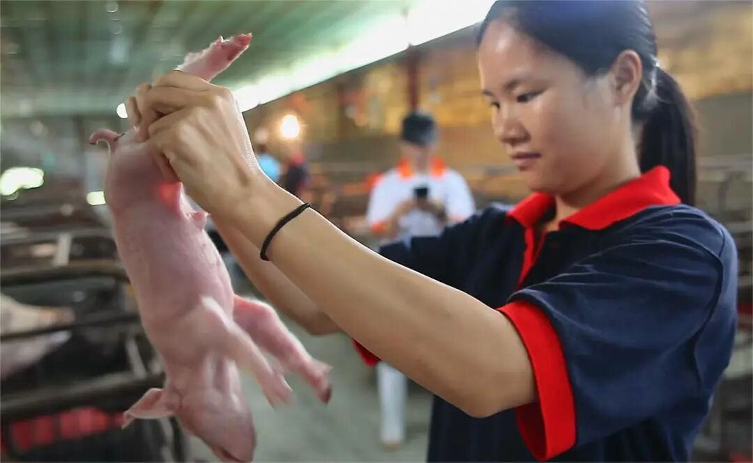 四川川繁猪生物科技有限公司育种技术人员察看种猪生长状况