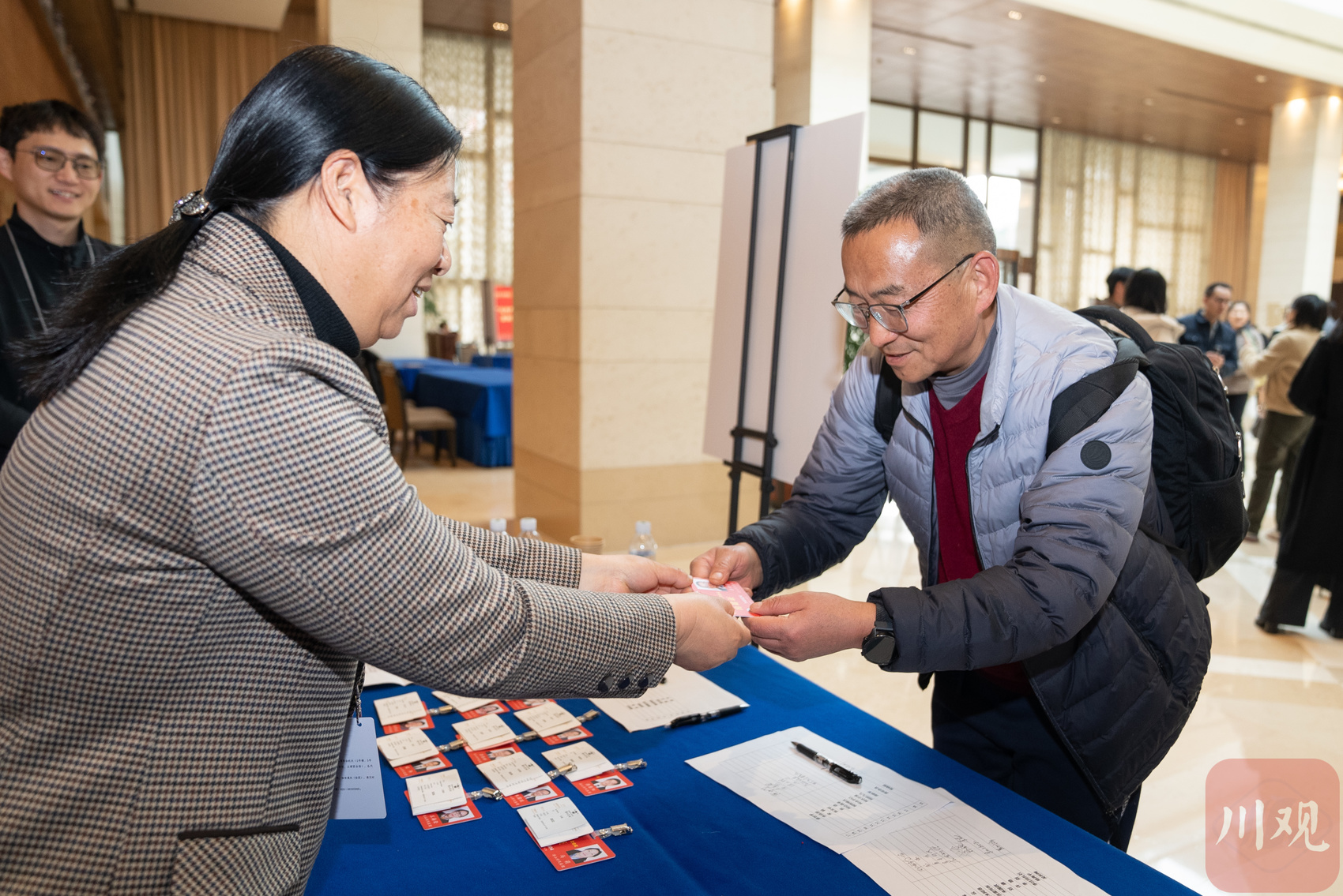 省人大代表履行报到手续,领取证件。